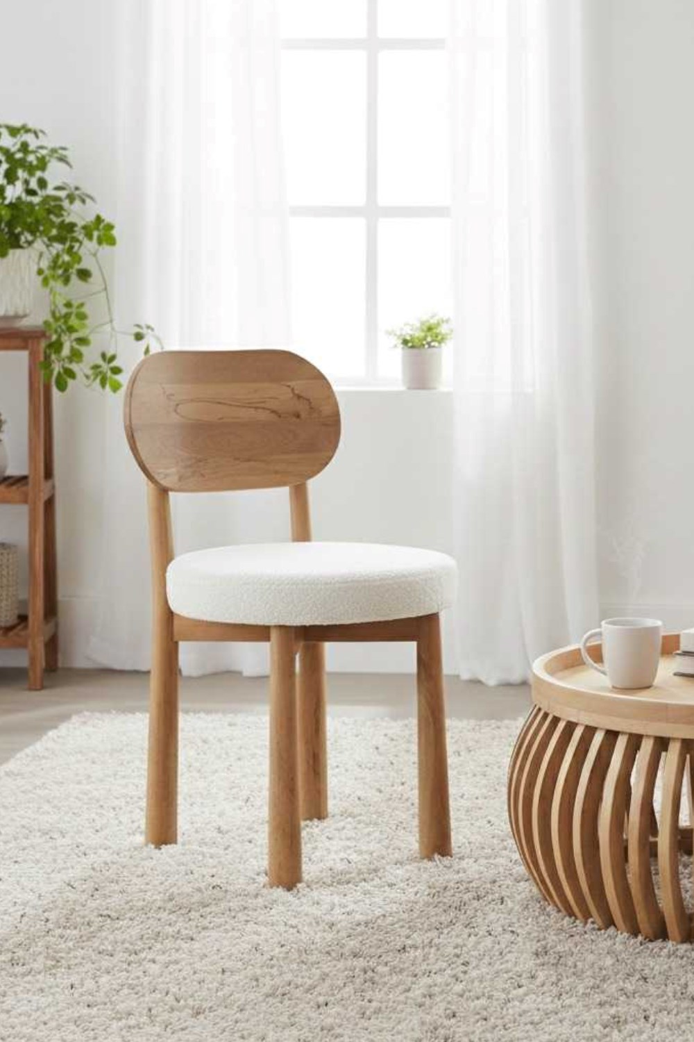 The generously proportioned seat is upholstered in soft ivory bouclé fabric, offering a luxurious and inviting texture that provides exceptional comfort. Ideal for long meals, family gatherings or relaxed dining, the chair delivers both style and practicality in equal measure.