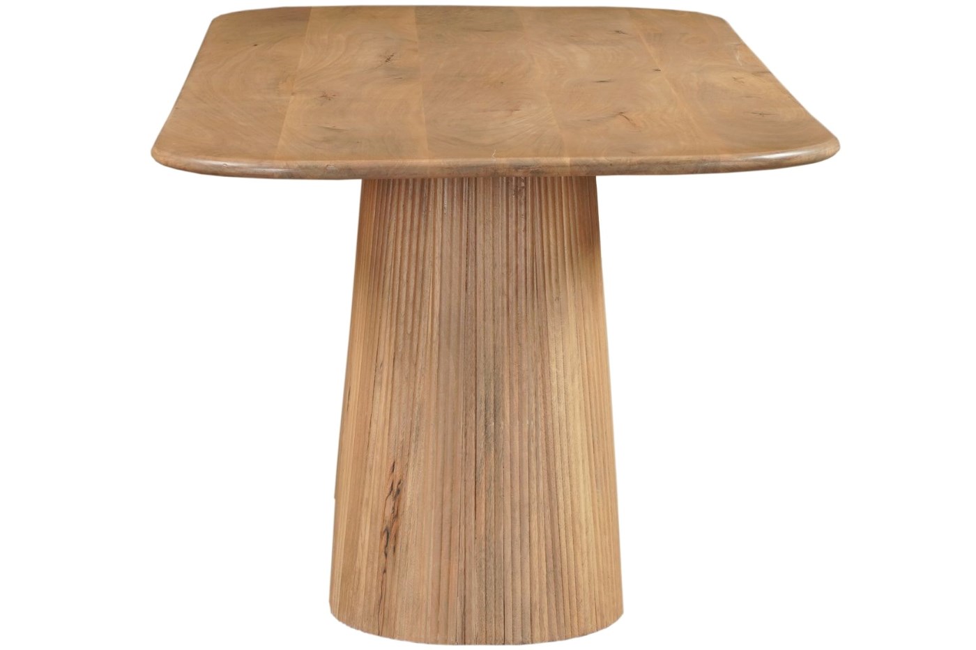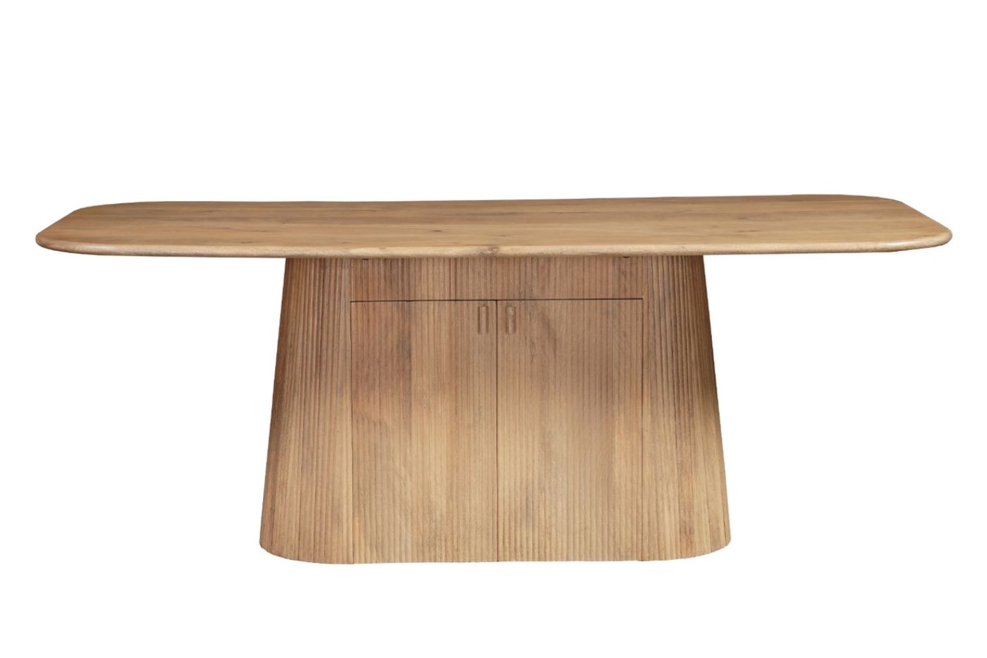 The sculptural fluted base, detailed with refined vertical ribbing, brings a sense of architectural elegance while retaining a natural, grounded presence. Discreetly integrated within the base are two spacious cabinets with hinged doors, providing practical storage for linens, placemats, candles or serving pieces, all seamlessly incorporated into the design.