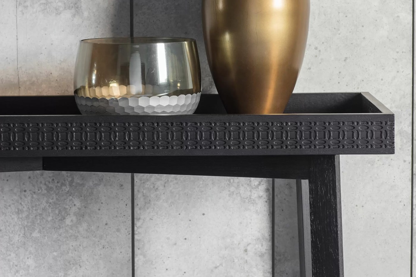 Crafted from Mango wood, timber veneers and MDF, this console table features a striking inlaid pattern and rich textures. Its sturdy construction ensures long-lasting elegance.