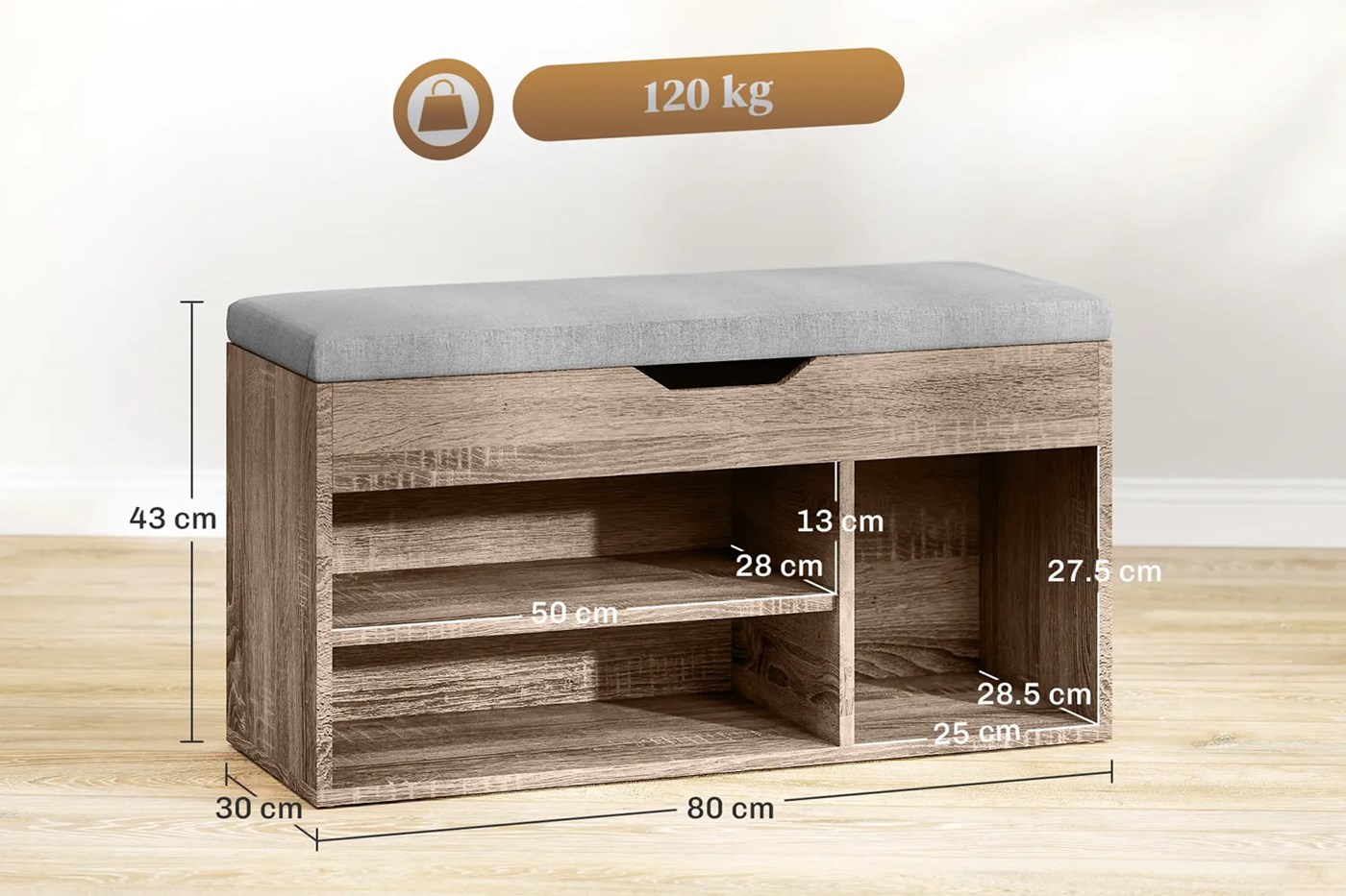 The 4cm thick sponge cushion seat provides a comfy place to sit while putting on or taking off shoes. Filled with soft foam, it offers great support and holds up to 120kg. It's a practical and comfortable addition to your entryway or bedroom.