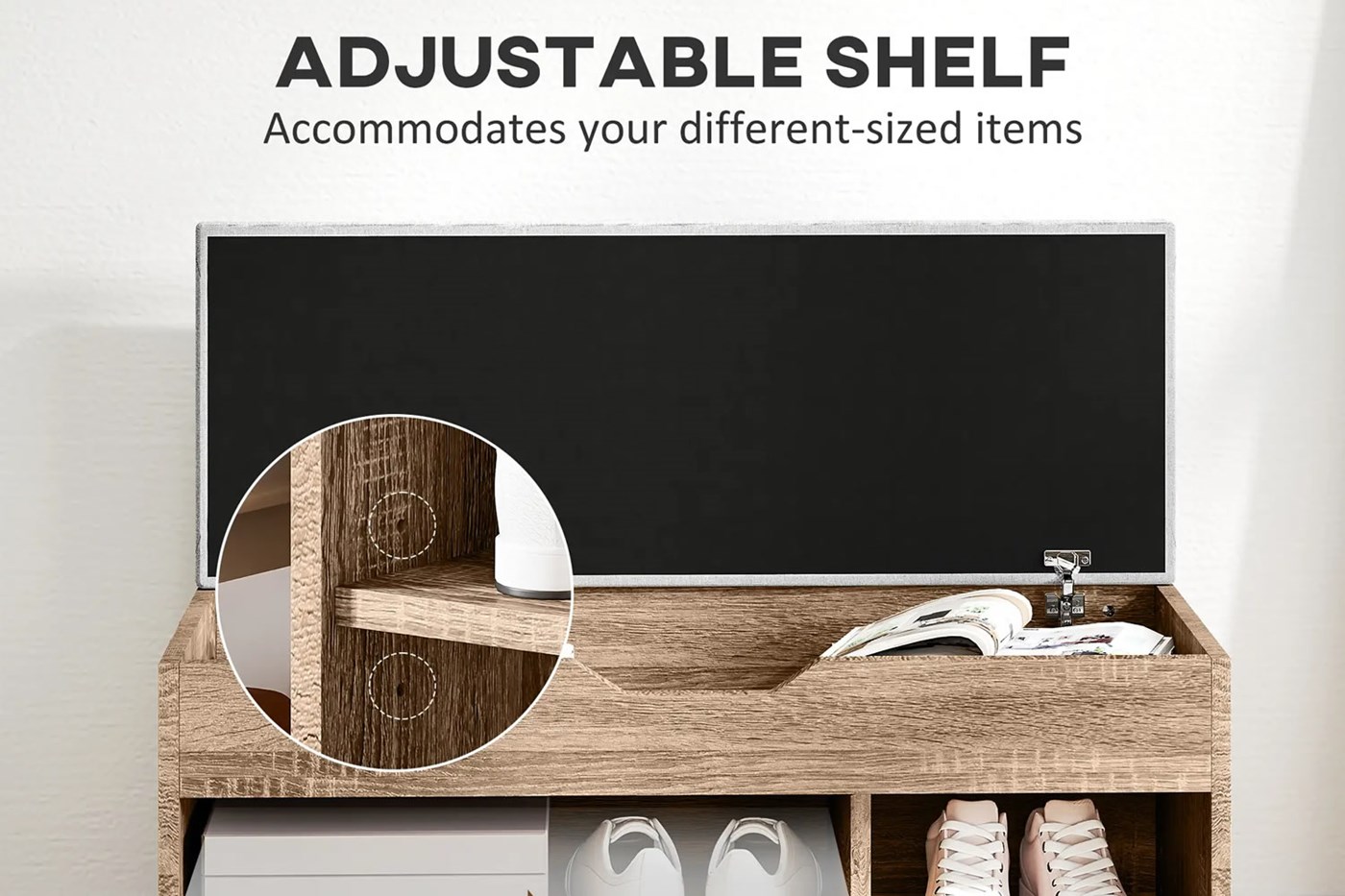 Three spacious compartments are designed for shoe storage. The left compartment has a removable, adjustable shelf to fit different shoe sizes or storage needs. Each shelf can hold up to 5kg, making it suitable for various footwear types.