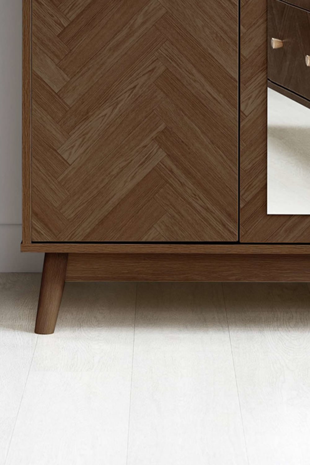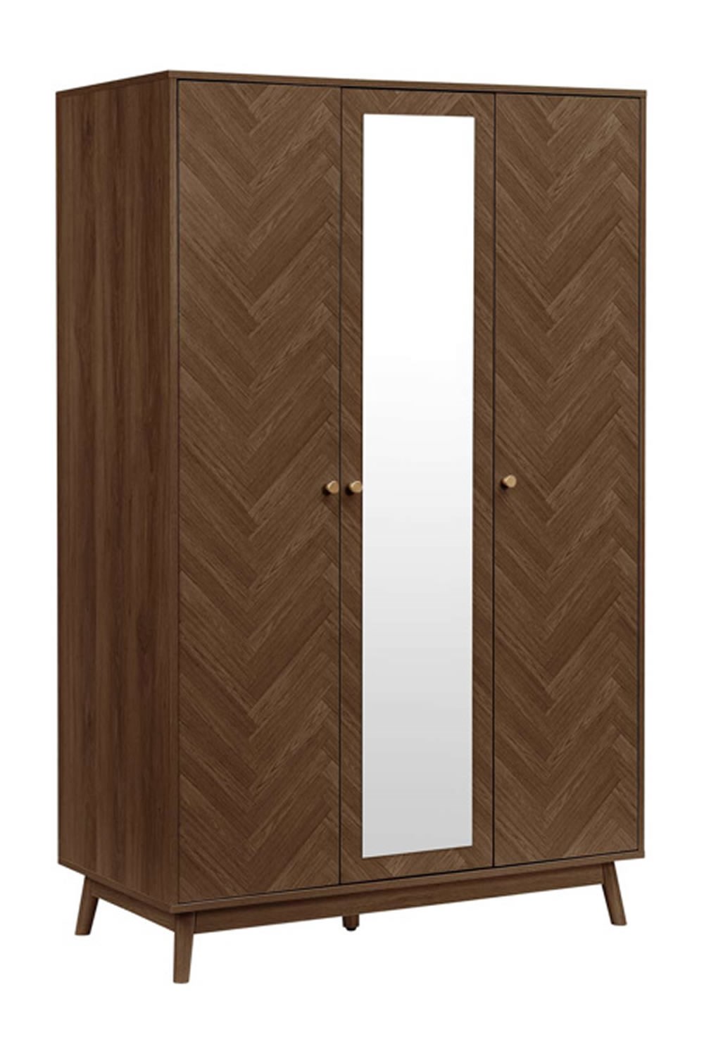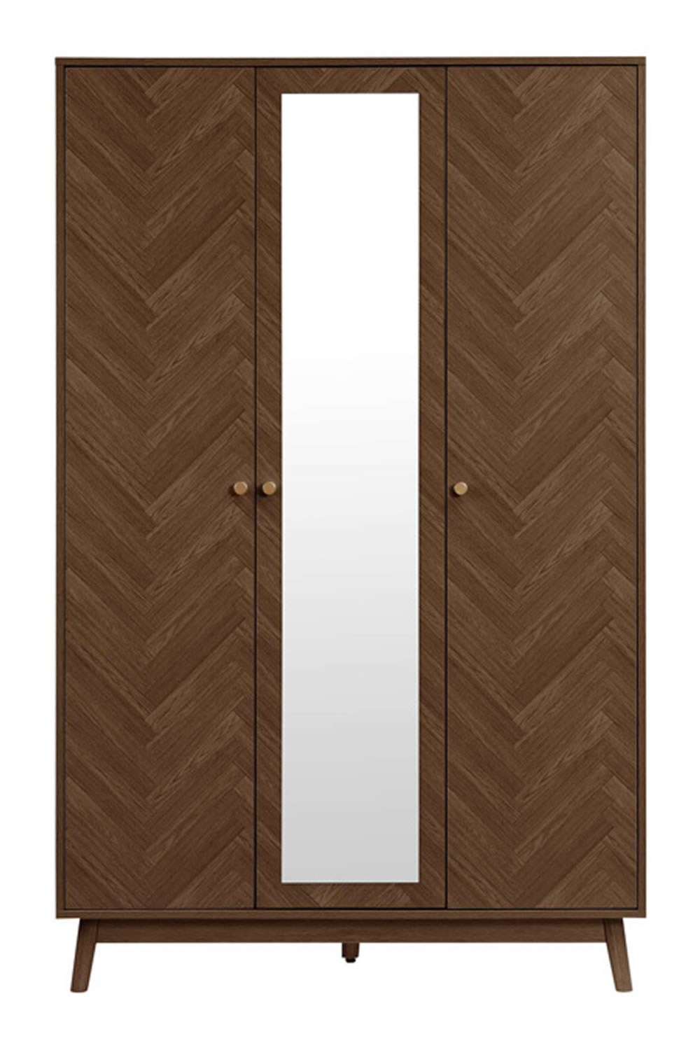 This wardrobe features two herringbone-patterned doors with a central full-length mirror that combines style and functionality. The mirror brightens and visually expands the room while providing a convenient spot for outfit checks. This combination of practicality and design makes it a standout piece for any interior.