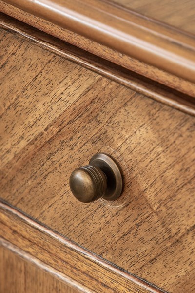 Each interaction with this sideboard is a pleasure, from the tactile satisfaction of its exceptional craftsmanship to the charming bronze-finished beehive pull handles. The spindle-turned legs not only provide stability but also enhance the overall design with their graceful presence.