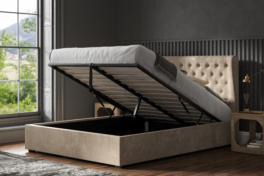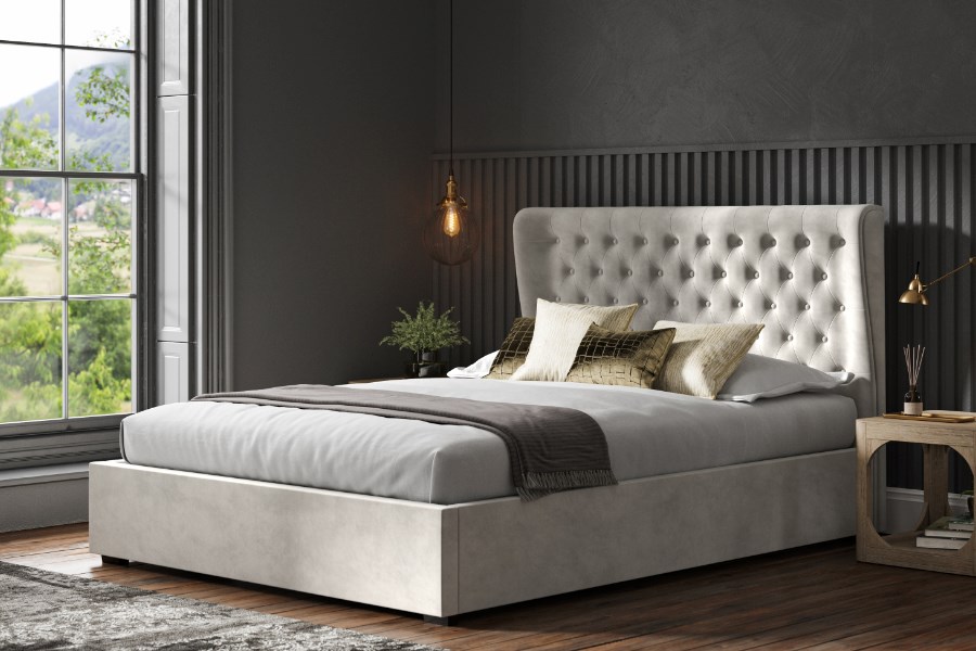 The Kensington Ottoman bed frame available in a modern grey or stone linen fabric is both stylish and practical. The deeply buttoned headboard with beautifully shaped winged sides finished in a rich grey linen fabric will add a statement to any room.
