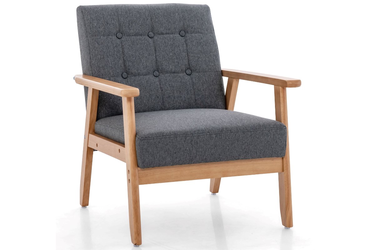 The chair has a graceful button-tufted backrest, as well as natural rubber wood armrests and legs that ensure durability and stability. The chair can hold up to 150kg.