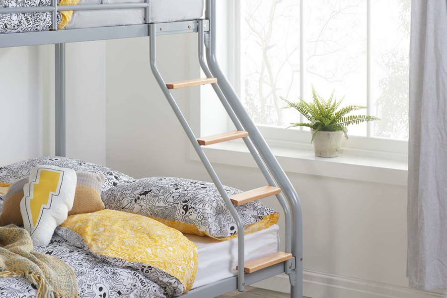 A bed with a difference, the Nexus offers a sleeping solution for three, great fun for the children. This is a steel frame, finished with an epoxy powder coated paint process and is available in silver.