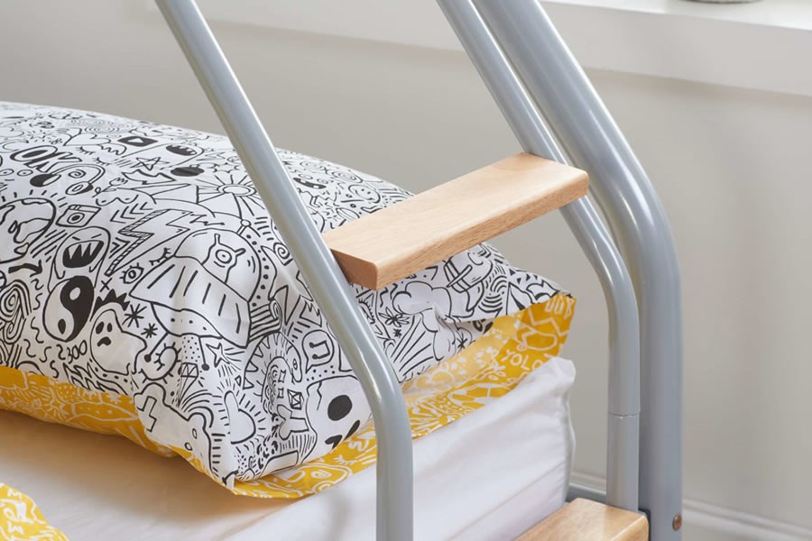 This frame also features beech coloured rubberwood post caps and ladder steps. The top sleeping bunk has a 3' sleeping area, whereas the bottom bunk offers a 4'6 sleeping space.
