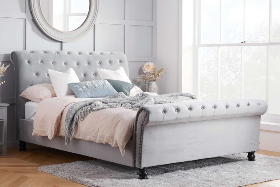 Stylish and sophisticated this stunning Opulence bed frame features a uniquely designed deep buttoned scroll head and foot board. The Opulence bed is upholstered in a luxurious grey velvet, contrasting deep dark wood sculptured legs.