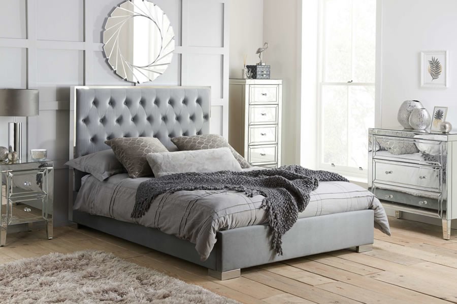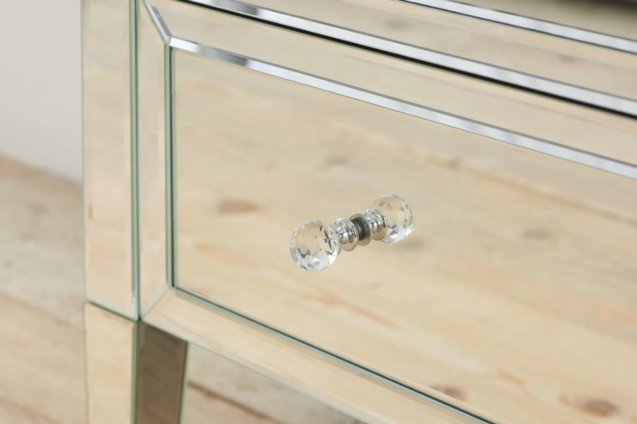 The Valencia 3 Drawer Chest is a gorgeous and luxurious piece of furniture that will add a touch of sophistication to any modern bedroom. The chest is constructed from a durable MDF frame and features a stunning mirrored effect with bevelled edges that will reflect light beautifully. The elegant mock crystal handles add a touch of glamour to the chest, making it a perfect addition to any stylish bedroom.
