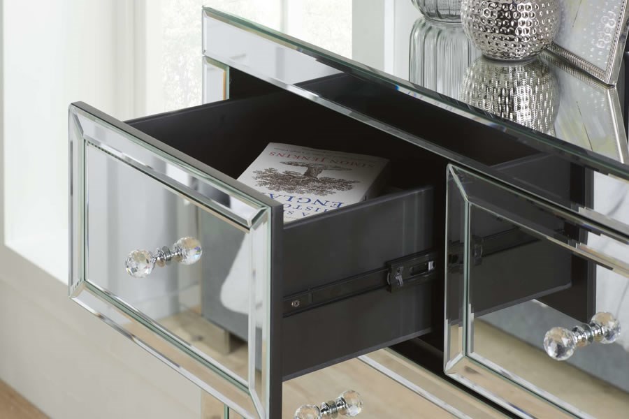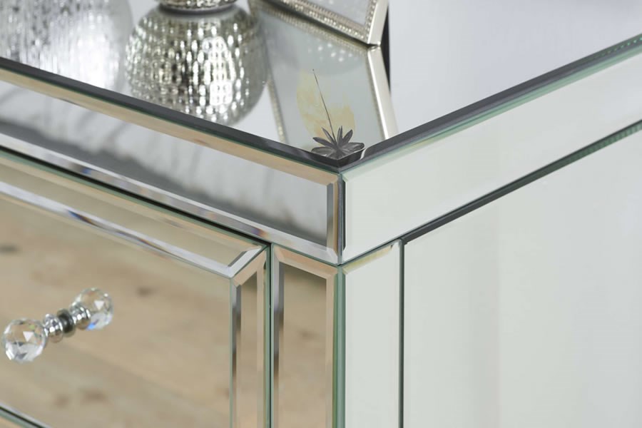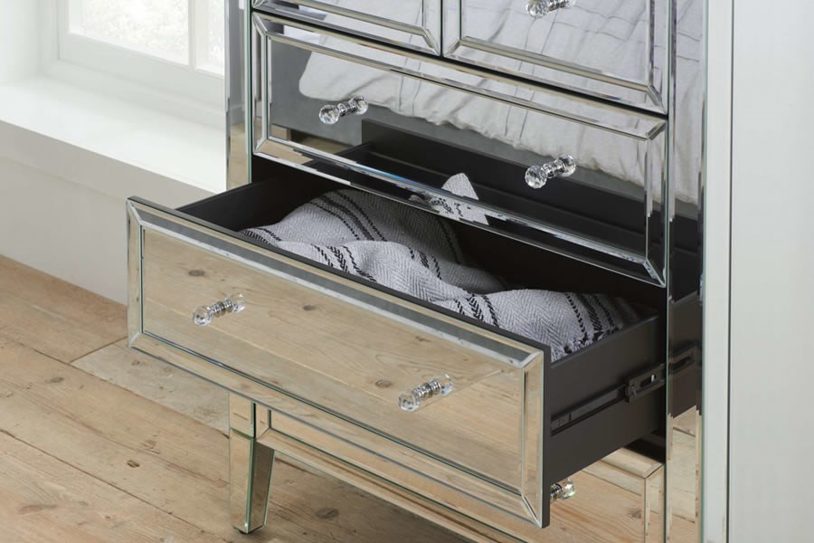 The Valencia 3 + 2 Drawer Chest is a gorgeous and luxurious piece of furniture that will add a touch of sophistication to any modern bedroom. The chest is constructed from a durable MDF frame and features a stunning mirrored effect with bevelled edges that will reflect light beautifully. The elegant mock crystal handles add a touch of glamour to the chest, making it a perfect addition to any stylish bedroom.
