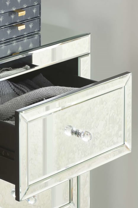 The Valencia 5 Drawer Narrow Chest is as tunning and luxurious piece of furniture that will add a touch of sophistication to any contemporary bedroom. The chest is constructed from a durable MDF frame and features a stunning mirrored effect with bevelled edges that will reflect light beautifully. The elegant mock crystal handles add a touch of glamour to the chest, making it a perfect addition to any stylish bedroom.