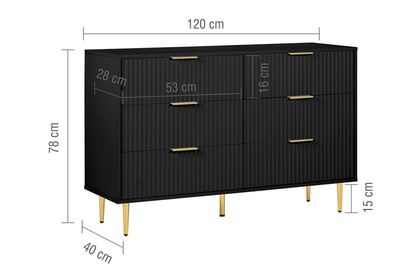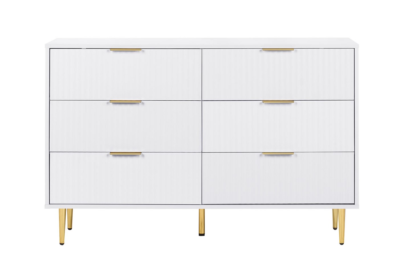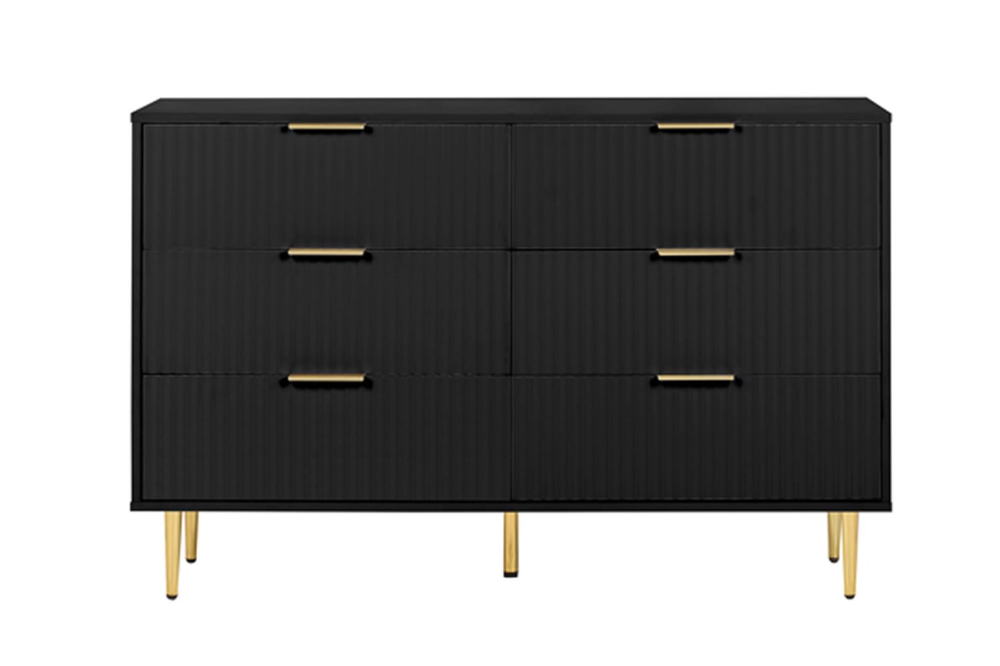 The Zara 6 drawer chest is the ultimate storage solution for a stylish bedroom. With six spacious drawers, it provides ample room to organise your clothing and accessories while maintaining a sleek, elegant look. The ribbed detailing across the drawer fronts, finished with slim gold handles and matching legs, adds a touch of luxury while keeping the design light and contemporary.